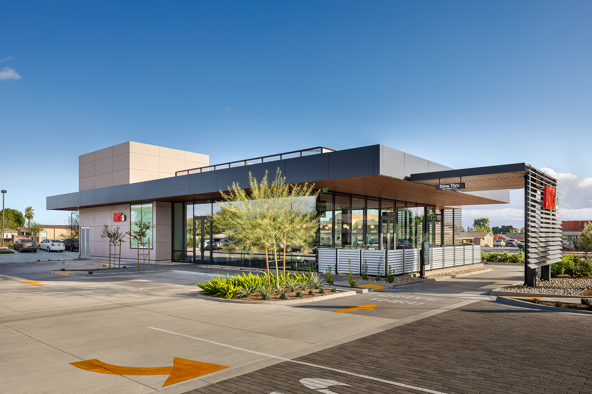 Program: A new restaurant with an outdoor patio and drive through lane.