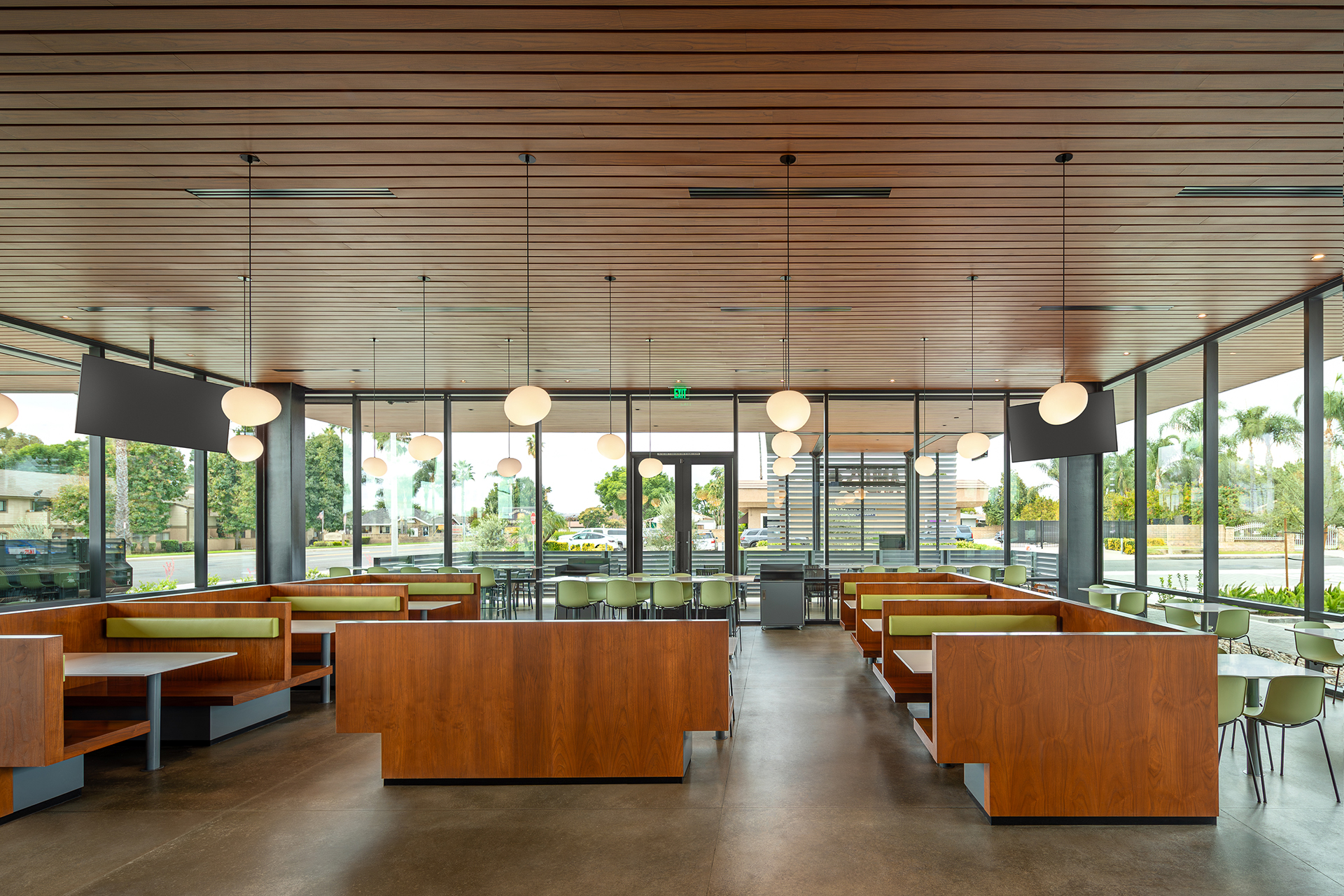 The design is divided between the kitchen and other back of house operations and two very open public areas. Bordered on three sides with floor to ceiling storefront windows, the dining room opens out to the surrounding neighborhood in the daytime. At night it becomes a warm and inviting “lantern” beckoning customers to come in. An open air dining patio lies immediately to the dining room’s west.