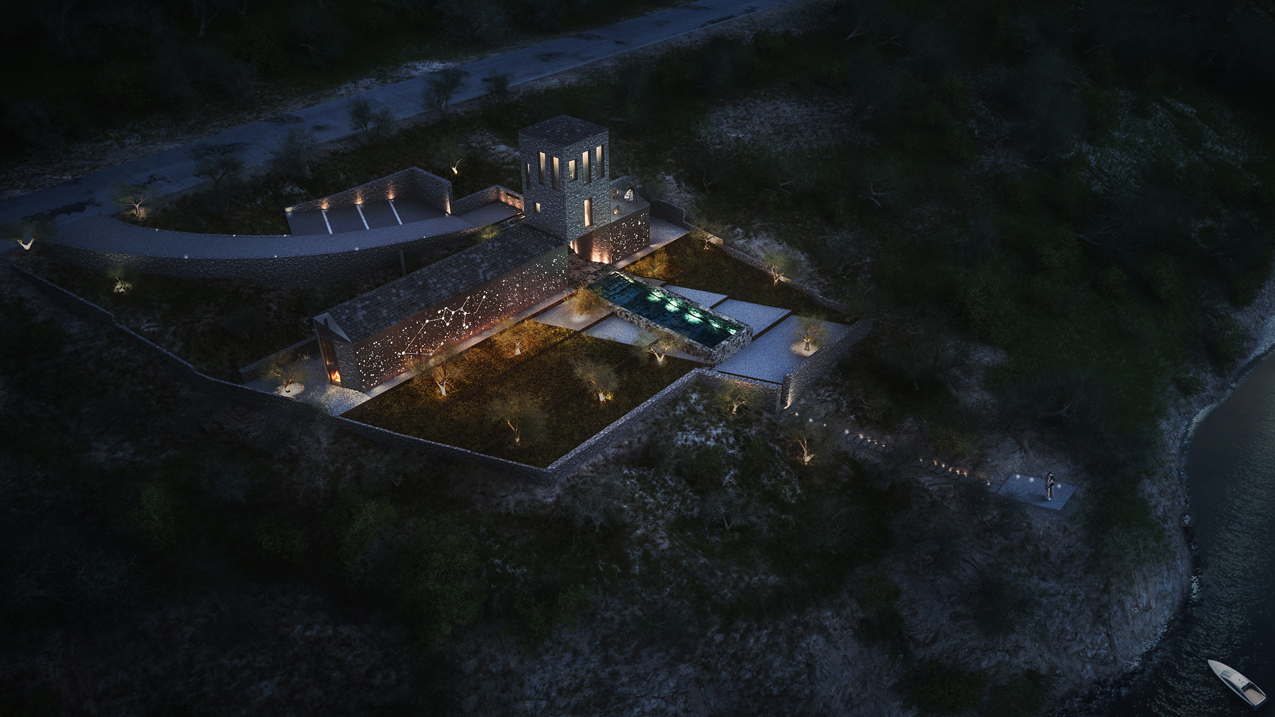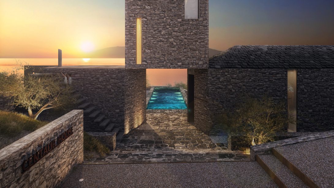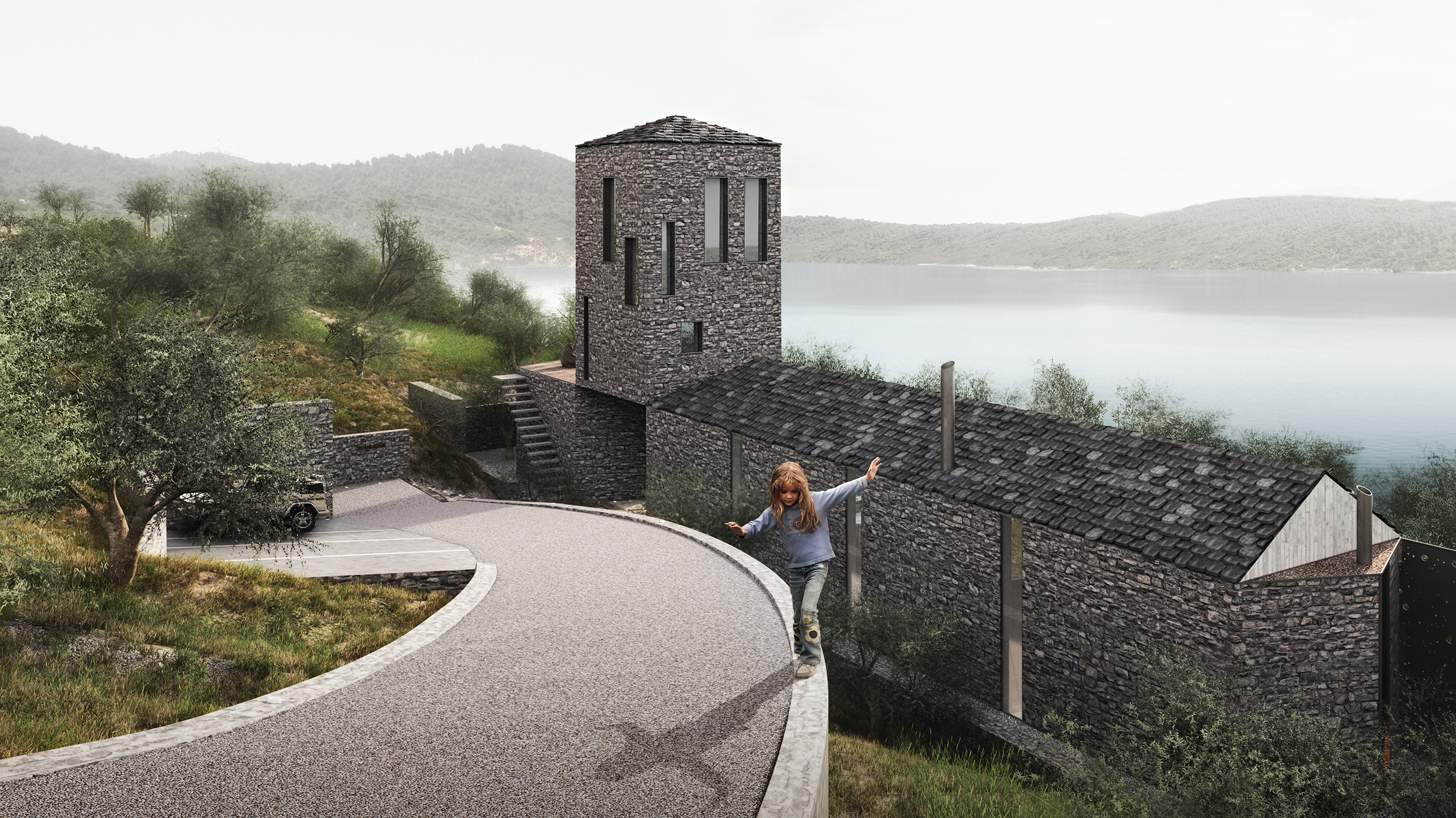 The site has very strict coastal setbacks and a limited buildable area. At the same time, it falls under historical restrictions that require the use of local stone and building techniques for both the walls and the roofs. The use of stone therefore came as a logical choice, that eventually makes the building an extension of its topography. Traditional and historical references to local architecture, led to a combination of masses, the linear sheds and the free standing tower that connects them.