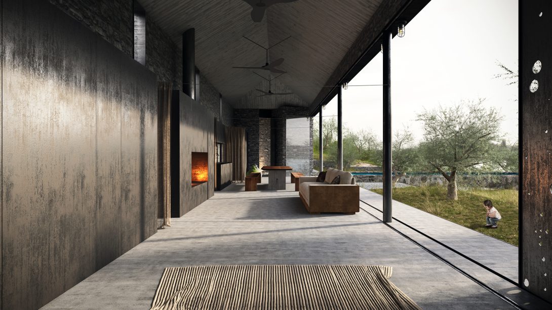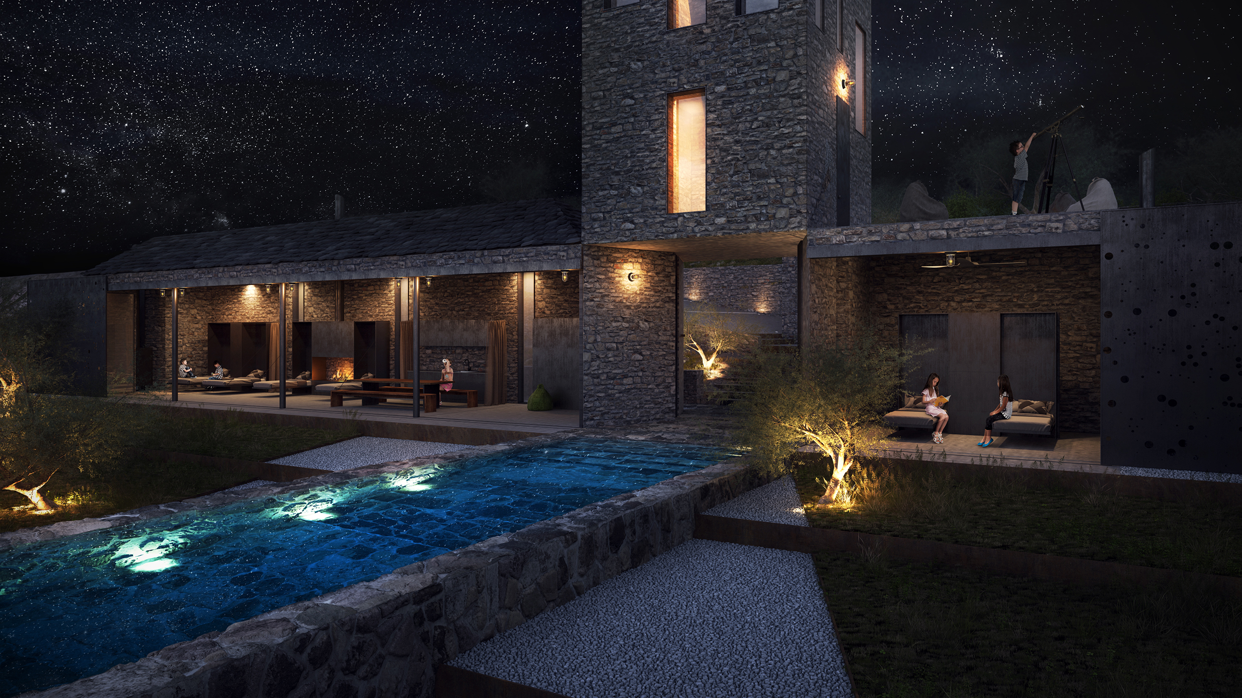 The house consists of 3 independent volumes, each one with its own access. While the approach to the house points to a rather familiar materiality, once you pass the breezeway you alternate to a boundless view, one that naturally seems to be spilling out of the interiors. You are under the tent and into the landscape. Each structure is derived from different techniques of tarp shelters, which in combination creates the camp. The interiors are very minimal, all functions are leaned against the back stone wall. The space is open, the beds fall down at night, lights are very low and all you need is good stories and friends. The large sliding doors that enclose the tent, playfully reference the Constellation of Centaurus, a reminder of he power of nature and the spirit of the vast sky.