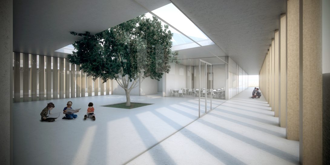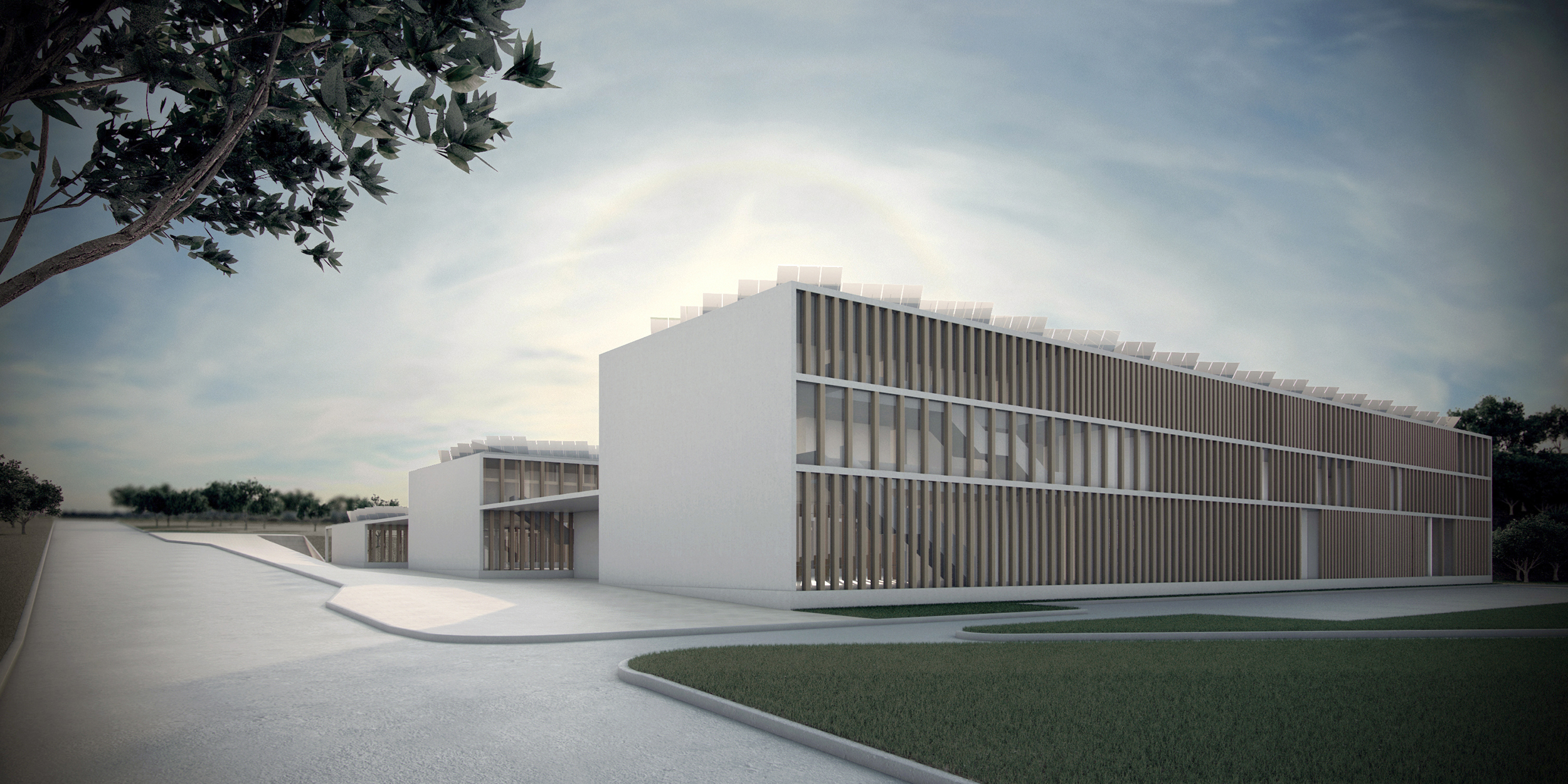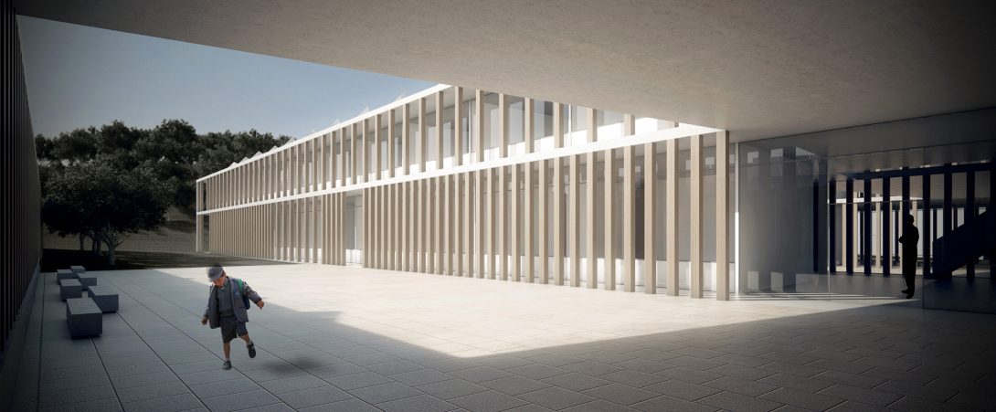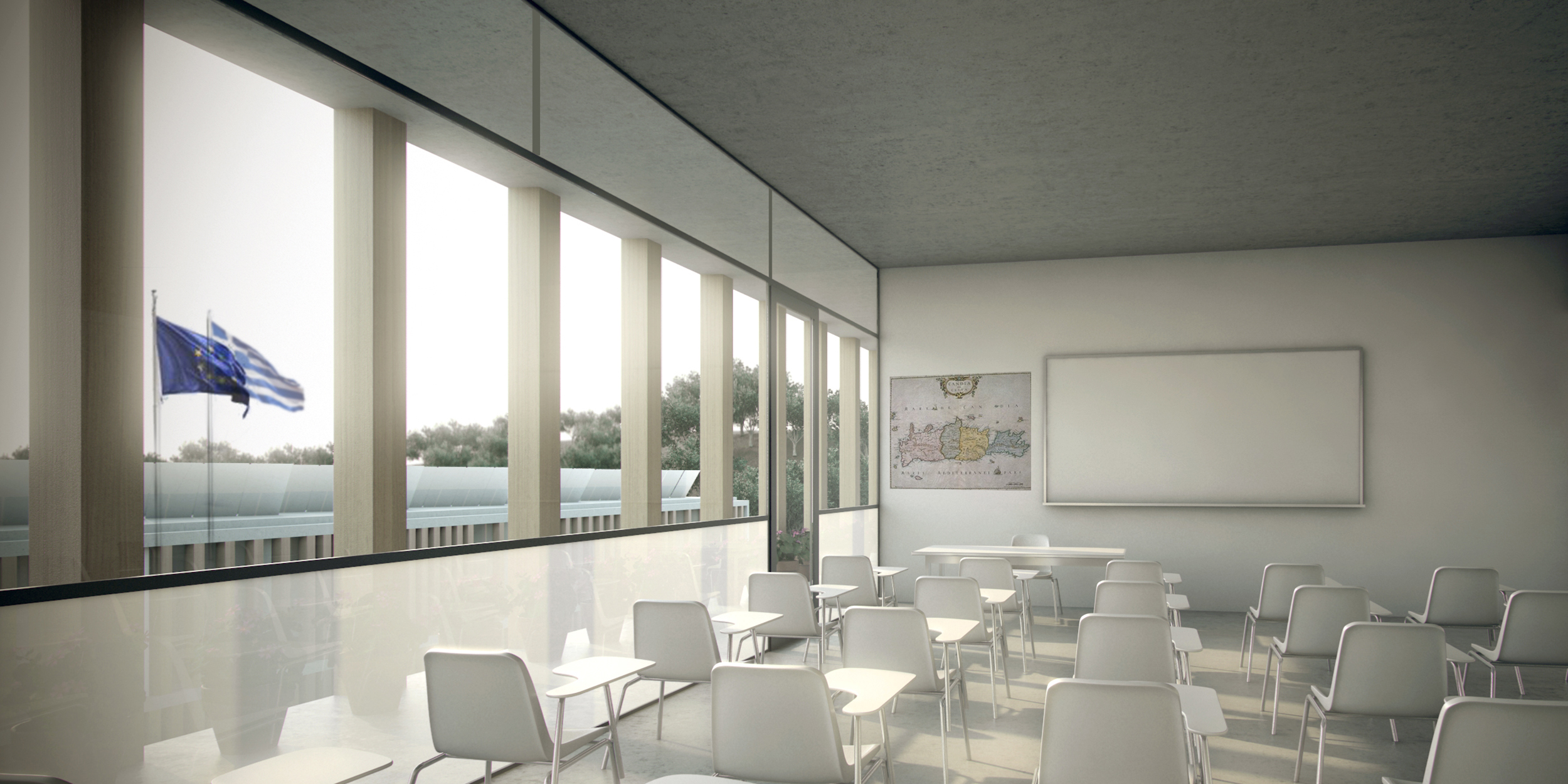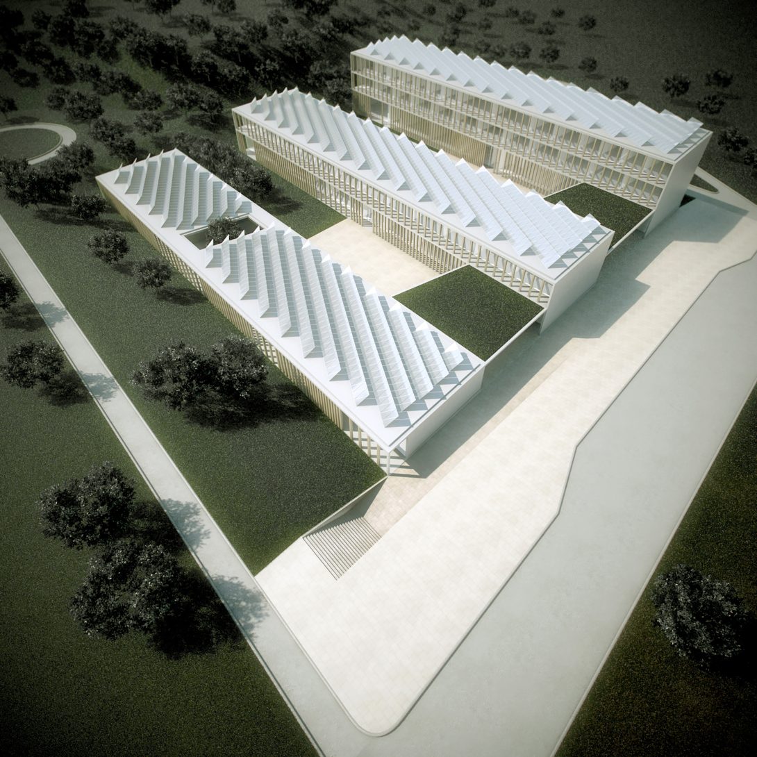 The challenge of designing an educational building that comprises three different levels of education is addressed by proposing a group of functionally different buildings with a formal and material unity. The three main programmatic areas are physically separated by courtyards and they take advantage of the topography in order to diminish the visual impact of the building by having the tallest building in the lowest part of the site and merge into the landscape letting the olive tree slopes interlock with the buildings. The use of open courtyards reinforce the interior activities. The presence of wooden columns lined verandas as buffer zones between the exterior and the interior establish a link with ancient Minoan architecture, and stress the idea that teaching and learning happen everywhere and anytime, vertically but also horizontally, between mates. The dependence on mechanical systems is greatly reduced by the precise early architectural decisions that regulate the effects of the environment on the comfort and its energy demands. Rather than having sustainable add-ons, the complex benefits from a holistic approach to the topographic, cultural and bioclimatic conditions of its place.