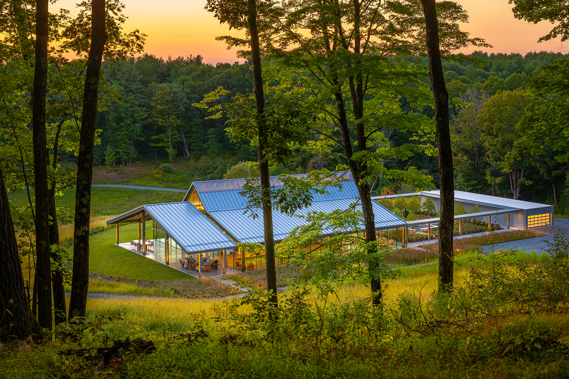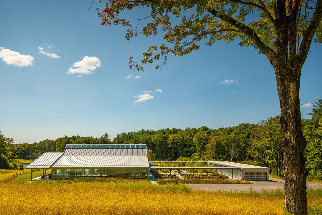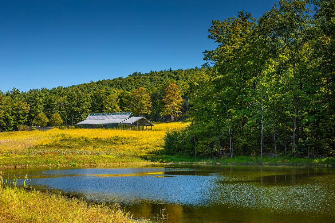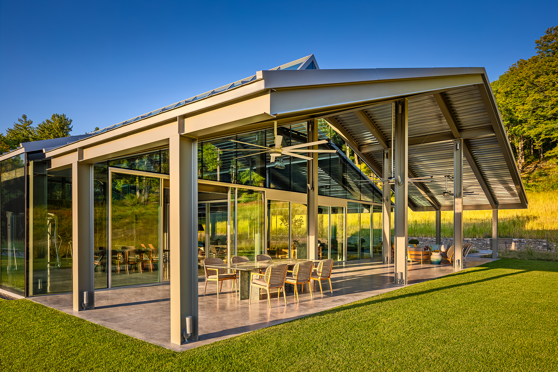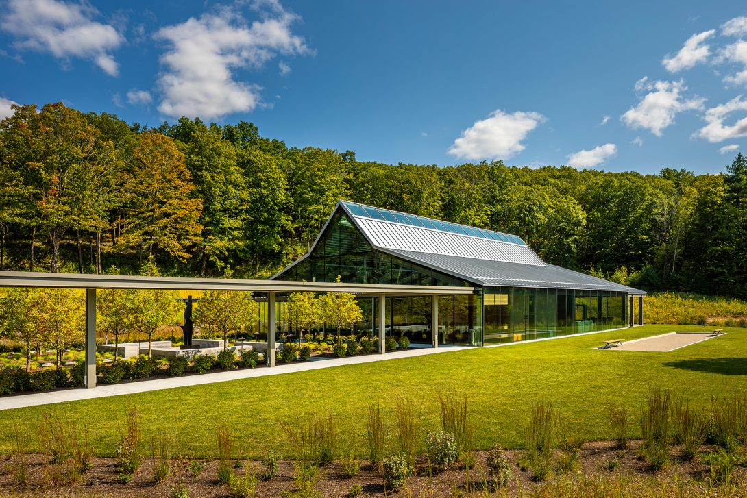 Sited on a small plateau in the Hudson Valley, the steel and glass Recreation Pavilion is a modern take of a traditional barn with breathtaking views of the surrounding forest, a panoramic lake, and the vibrant sky beyond. Visitors approach via a tree-lined courtyard defined by a steel column stoa, the primary structure on one side and a secondary support structure on the opposite end. The Pavilion becomes the backdrop for a prominently placed sculpture, creating a space for repose and meditation.