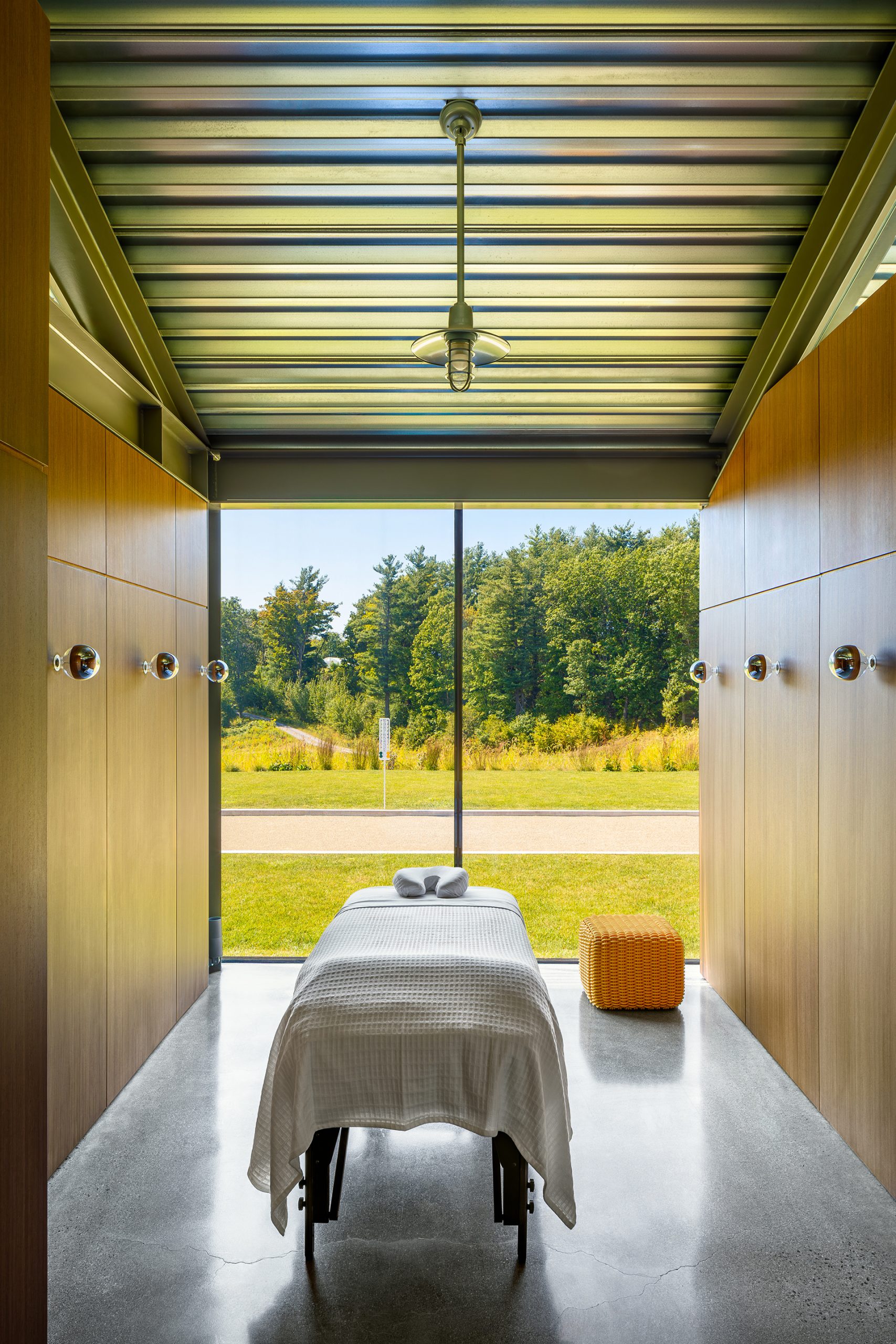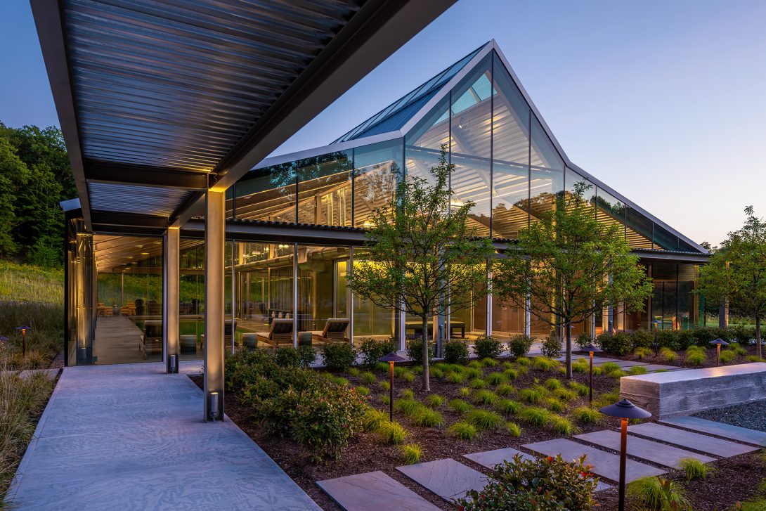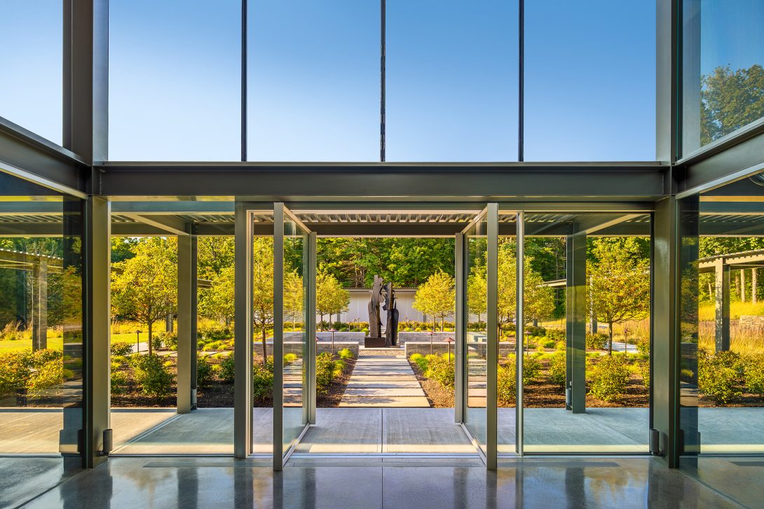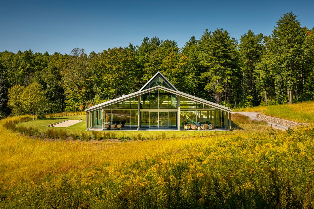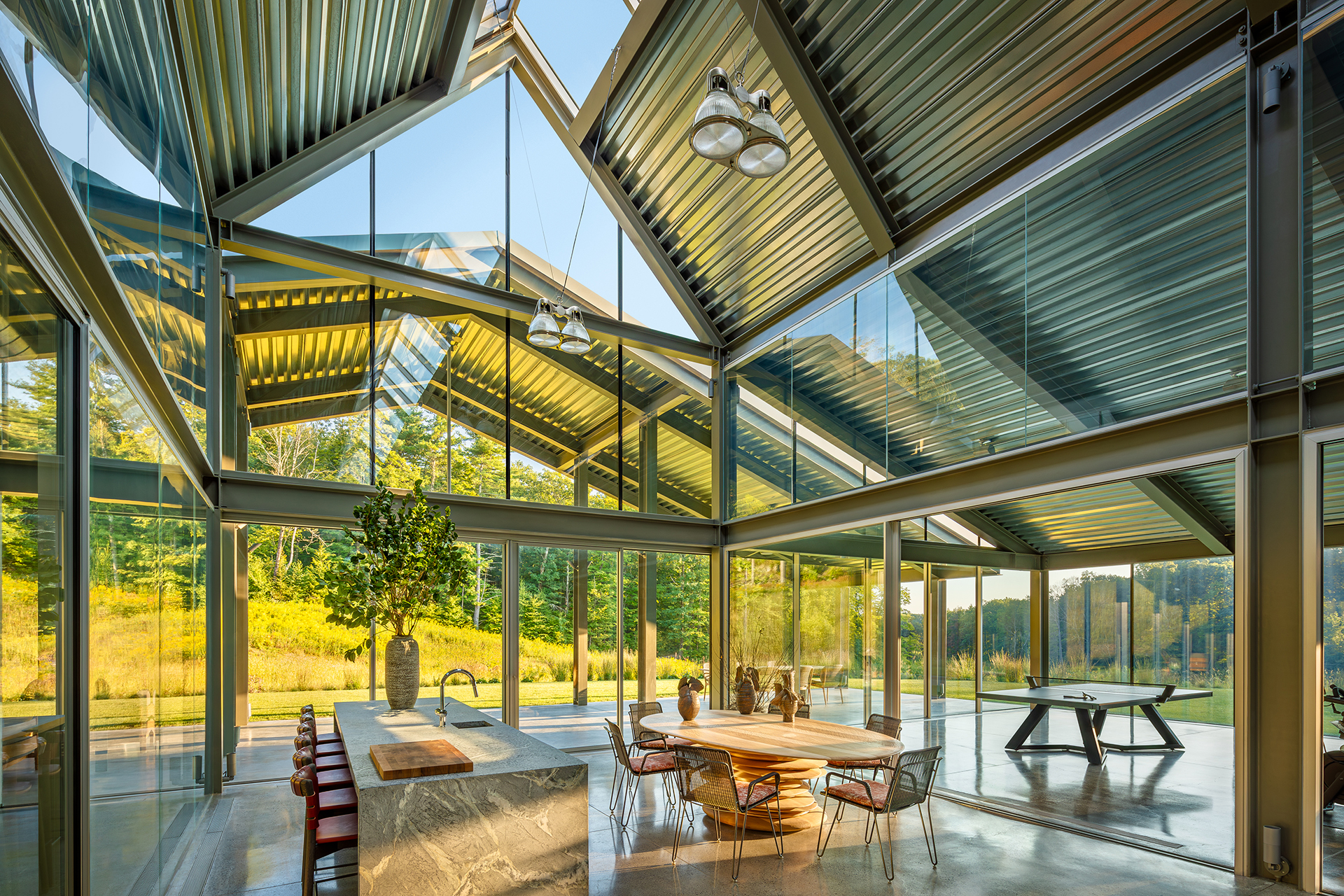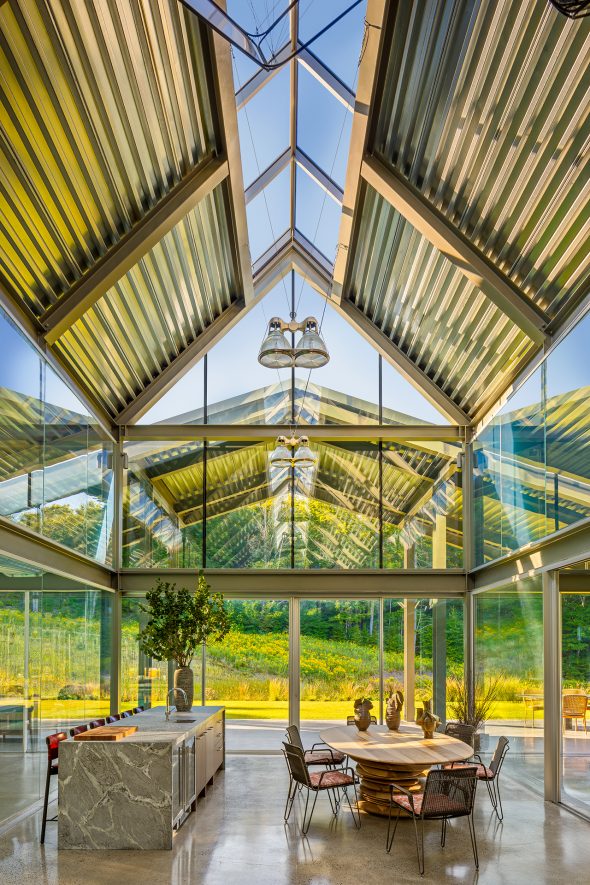 Sited on a small plateau in the Hudson Valley, the steel and glass Recreation Pavilion is a modern take of a traditional barn with breathtaking views of the surrounding forest, a panoramic lake, and the vibrant sky beyond. Visitors approach via a tree-lined courtyard defined by a steel column stoa, the primary structure on one side and a secondary support structure on the opposite end. The Pavilion becomes the backdrop for a prominently placed sculpture, creating a space for repose and meditation.